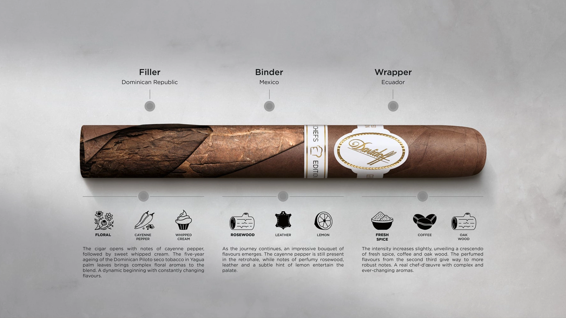 Tobaccos from Davidoff's iconic White Band Collection, mirroring the chef's signature lightness and finesse.