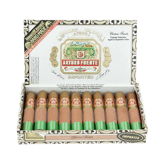 The Arturo Fuente Chateau Fuente is a premium Dominican cigar measuring 4½ inches with a 50 ring gauge. Wrapped in a smooth Connecticut Shade wrapper over aged Dominican binder and filler, it offers a mild to medium-bodied profile. Flavours of cedar, cream, nuts, and gentle spice create a balanced and refined smoke. Expertly constructed at Tabacalera A. Fuente y Cia, it delivers an even burn and smooth draw. Presented in a cedar sleeve with a green ribbon, the Chateau Fuente exemplifies elegance, tradition, and the hallmark quality of the Fuente family.