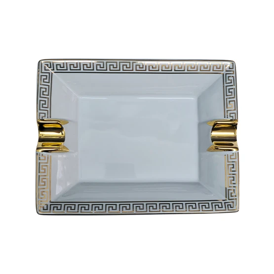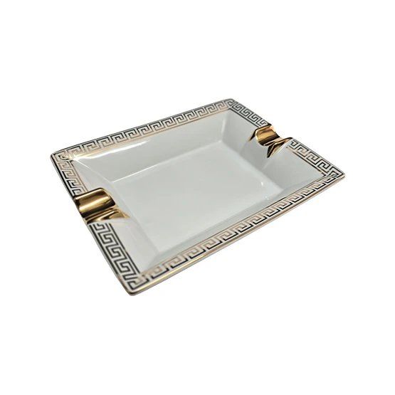 The BLD Ceramic Greek Mosaic Square Cigar Ashtray (2 Cigar Rest) features a luxurious white and gold design inspired by classic Greek patterns. Crafted from durable ceramic, it offers two cigar rests and a deep, easy-to-clean bowl, making it both a stylish and practical addition to any cigar collection.