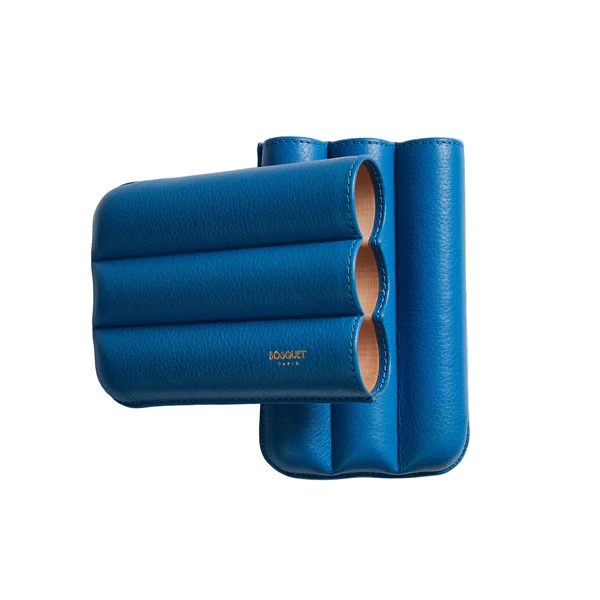 The Bosquet Paris Fluted Capri Blue Grained Calf Leather Cigar Case is a luxurious accessory crafted in France, showcasing refined elegance and craftsmanship. Made from premium grained calf leather in a vibrant Capri Blue finish, it securely holds up to three cigars of up to 60 ring gauge. The interior features smooth, vegetable-tanned leather to preserve cigar freshness and prevent damage. Its five-ply construction ensures durability, while minimal visible stitching gives it a clean, sophisticated look. Embellished with a 22-carat gold Bosquet Paris signature, this lightweight yet sturdy case is an ideal companion for refined cigar enthusiasts.