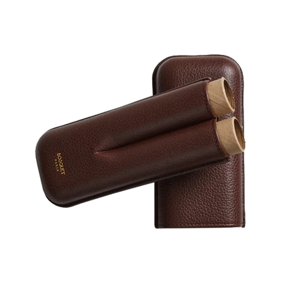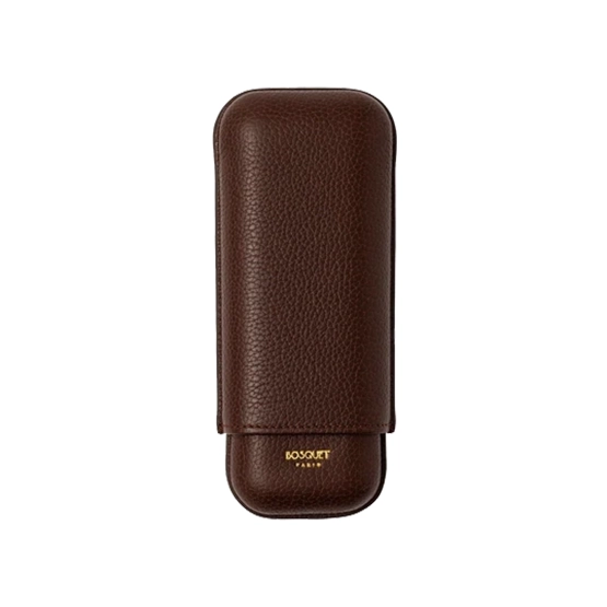 The Bosquet Paris Palissander Dark Brown Grained Calf Leather Cigar Case for two cigars is a luxurious French accessory blending elegance and practicality. Handcrafted from premium grained calf leather, it securely holds two cigars with a ring gauge of 60. The interior features a vegetal leather lining to maintain optimal freshness, while the sleek cylindrical design ensures portability. Minimal stitching and a subtle 22-carat gold Bosquet Paris signature enhance its refined appearance. Lightweight yet durable, this case combines sophistication with functionality, making it an essential companion for cigar enthusiasts.