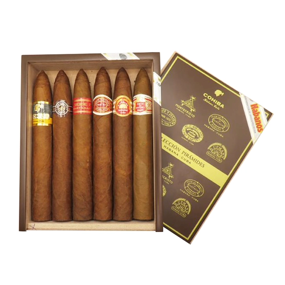 This Pirámides selection (52 ring gauge x 6 1/8″) lets you experience the distinct flavours of six prestigious Habanos brands through one of Cuba’s most beloved cigar formats. Each cigar shares the same iconic Pirámides format, ensuring a consistent draw, burn, and overall structure. This uniformity allows aficionados to truly appreciate and compare the unique flavour profiles, strengths, and signature styles of each Havana house. Designed for experienced smokers with time to savour a longer, richer smoke, the Pirámides vitola offers depth, complexity, and a slow, rewarding burn.