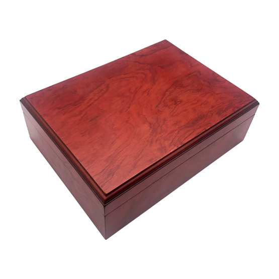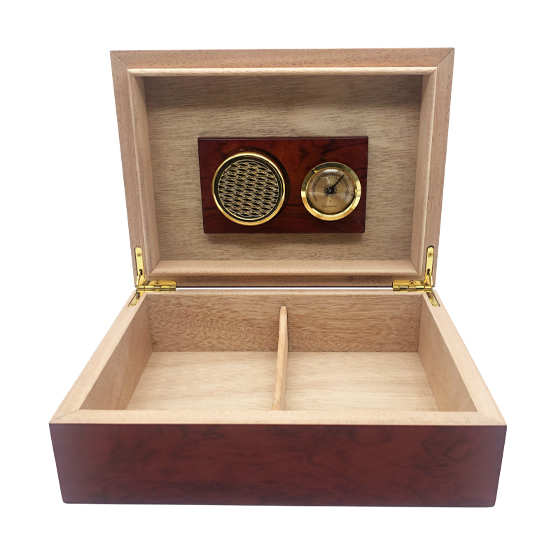 A beautiful humidor that offers a sleek look with functionality, keeping your cigars in the perfect condition in a wooden box that adds a luxurious aesthetic to any room. The humidor is cedar lined and come with a sponge humidification system, humidity gauge and a Boveda seasoning pack.