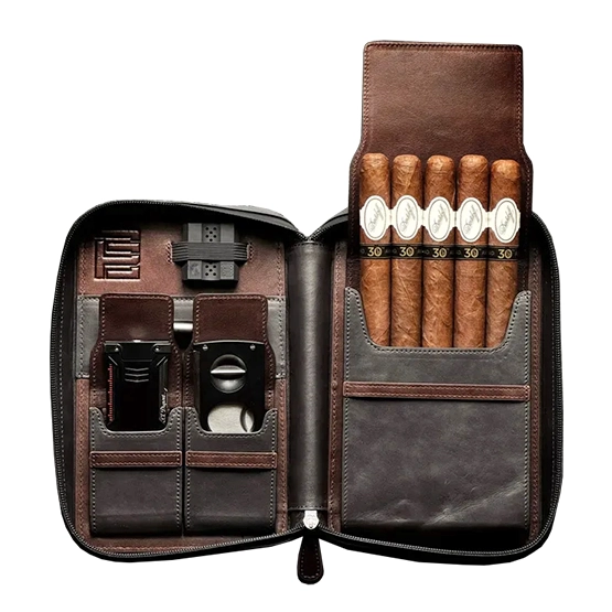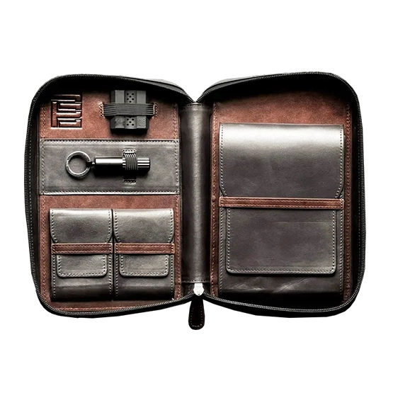 Presenting the “Midnight Brown” Cigar Travel Case — a stylish, functional companion for the modern cigar aficionado. Crafted from premium top-grain leather, it offers durability with refined elegance. Designed with a collapsible cigar pocket, dual accessory storage, dedicated slots for tools and rests, plus a Boveda humidity sleeve and rubber-sealed zip for freshness. Combining form, function, and sophistication, it’s perfect for travel and protection. (Accessories and cigars not included.)