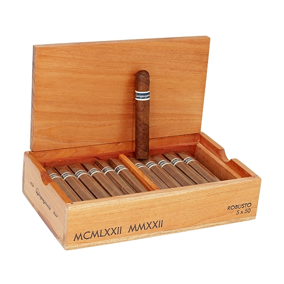 Wrapped in a dark tan Ecuadorian Sumatra-seed maduro leaf, the Quinquagenario features premium Dominican binder and filler tobaccos, aged for a full year after rolling to achieve exceptional balance. The flavour profile is rich and refined, offering notes of dark chocolate, espresso, roasted nuts, and black pepper, underpinned by a creamy, evolving sweetness. Impeccably constructed by elite torcedores, it delivers a flawless draw, even burn, and dense aromatic smoke—making the Quinquagenario a story-driven, celebratory cigar that truly stands apart.