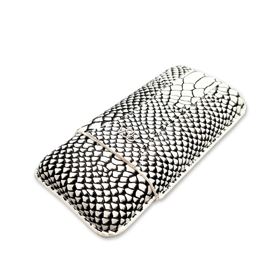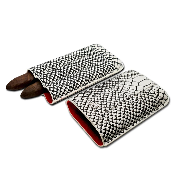 Luxury Snake leather 3 finger telescopic cigar case. Master crafted using the finest snake leather. Designed with a modern look and a classic style for all cigar aficionados. Beautifully created to hold up to 3x 60 gauge cigars to meet all cigar lovers needs. The internal walls of the case are lined with our signature, highly wear resistant, red velvet to protect your timeless smokes. Main body is sufficiently flexible yet ridged to hold and protect your cigars. Comes in a gift box.