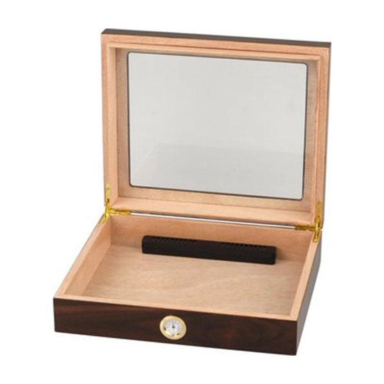 The Walnut Humidor with Glass Top for 20 cigars is tremendous value for money. Great for beginners. Includes an external hygrometer and internal humidifier. To maintain the proper humidity in your humidor, use a few drops of PG Solution and fully charge the humidification unit. For different temperatures and extended storage, it may be advisable to recharge the humidification unit as needed, but this will depend on number of cigars, humidity, temperature and cigar freshness.